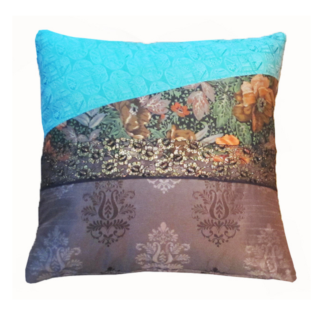 Handmade cushion cover made from fabric collected from vintage markets and fairs and decorated with ribbon and lace. Fastened with a zip. Top section has gold effect on fabric, middle section is textured velvet effect.